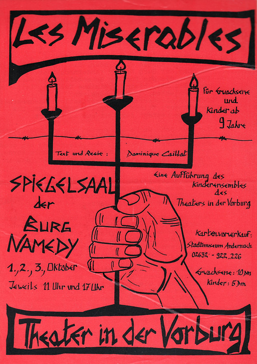 VALJEAN.- Nach einer Pause. He! Komm her!... He! Wo bist du? Komm zurück! Hier ist dein Geld! Das Kind ist verschwunden. Jean Valjean steht jetzt vor dem Publikum. Er spricht vor sich hin: Er ist weg. Warum musste er mich so ärgern? Ich bin ein Dieb. Das sagen doch alle. Ich bekomme nirgendwo ein Zimmer, nirgendwo Arbeit. Keiner will mich haben. Er schreit. Javert! Wo bist du? Leiser. Ich bin ein Dieb. Er tritt von vorne ab.